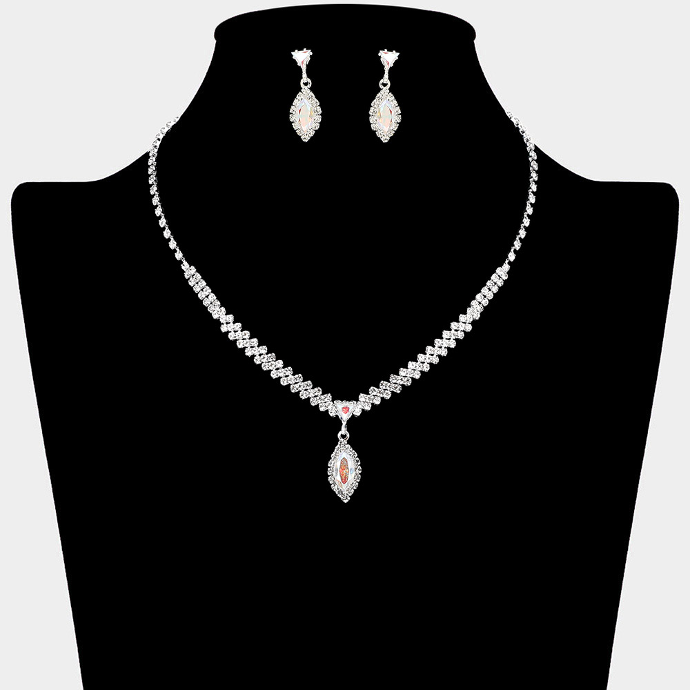 Details • Necklace Size : 14" + 5" L • Decor Size : 1.2" L • Earrings Size : 1" L • Elegant jewelry set featuring a crystal teardrop pendant necklace with matching earrings. The sparkling rhinestone accents and refined setting create a timeless look, perfect for weddings, evening events, or adding sophistication to any formal outfit. • CZ Cubic Zirconia • Lead and Nickel Compliant