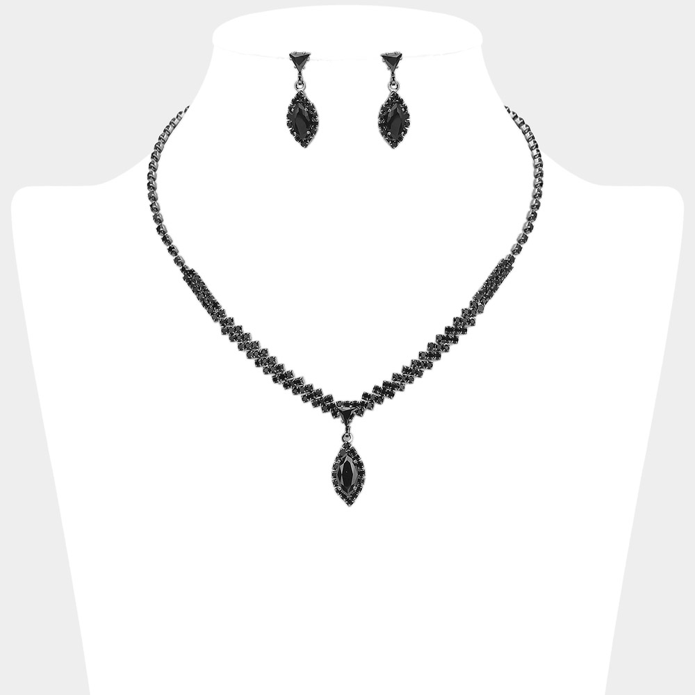 • Elegant jewelry set featuring a crystal teardrop pendant necklace with matching earrings. The sparkling rhinestone accents and refined setting create a timeless look, perfect for weddings, evening events, or adding sophistication to any formal outfit.