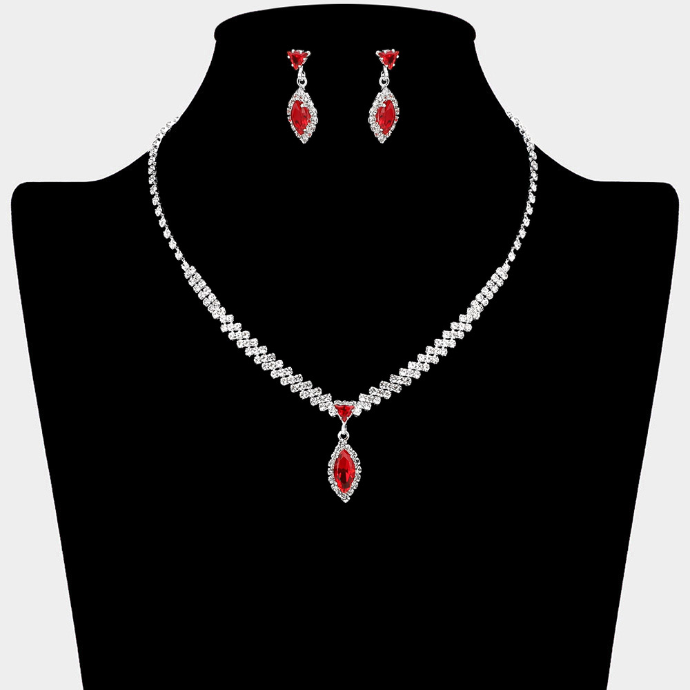 • Elegant jewelry set featuring a crystal teardrop pendant necklace with matching earrings. The sparkling rhinestone accents and refined setting create a timeless look, perfect for weddings, evening events, or adding sophistication to any formal outfit.