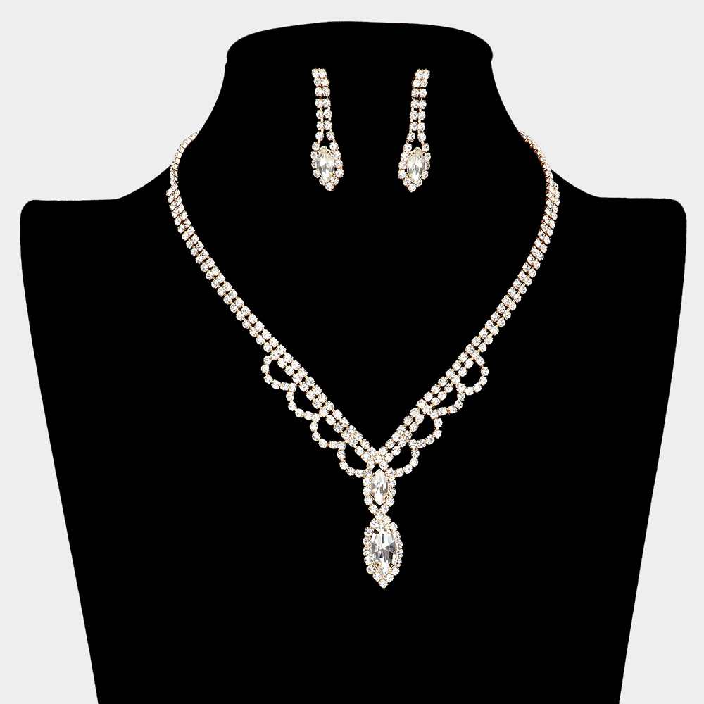 Details • Necklace Size : 11" L + 4" L • Decor Size : 1.5" L • Earring Size : 1.25" L • Shine with elegance in this draped crystal necklace and earring set. Perfect for weddings, parties, and special occasions, this jewelry set features a refined cascading design that adds sparkle and sophistication to any formal look. • Lead and Nickel Compliant