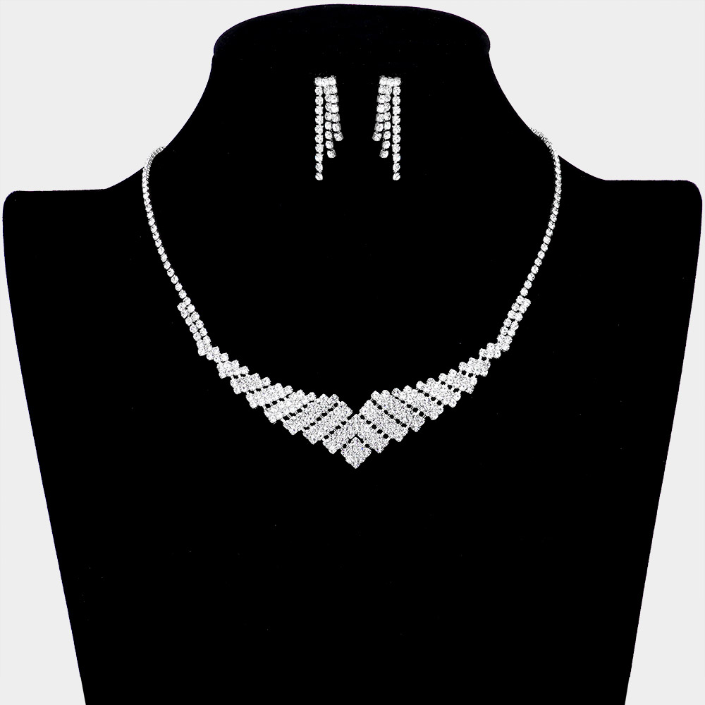 Details • Necklace Size : 13" + 4" L • Decor Size : 0.5" L • Earrings Size : 1.1" L • Dazzle at weddings, parties, or proms with this rhinestone chevron necklace and matching earrings set. The layered geometric design brings brilliance and refinement, making it the perfect accessory for formal events, evening looks, and any celebration that calls for timeless sparkle.