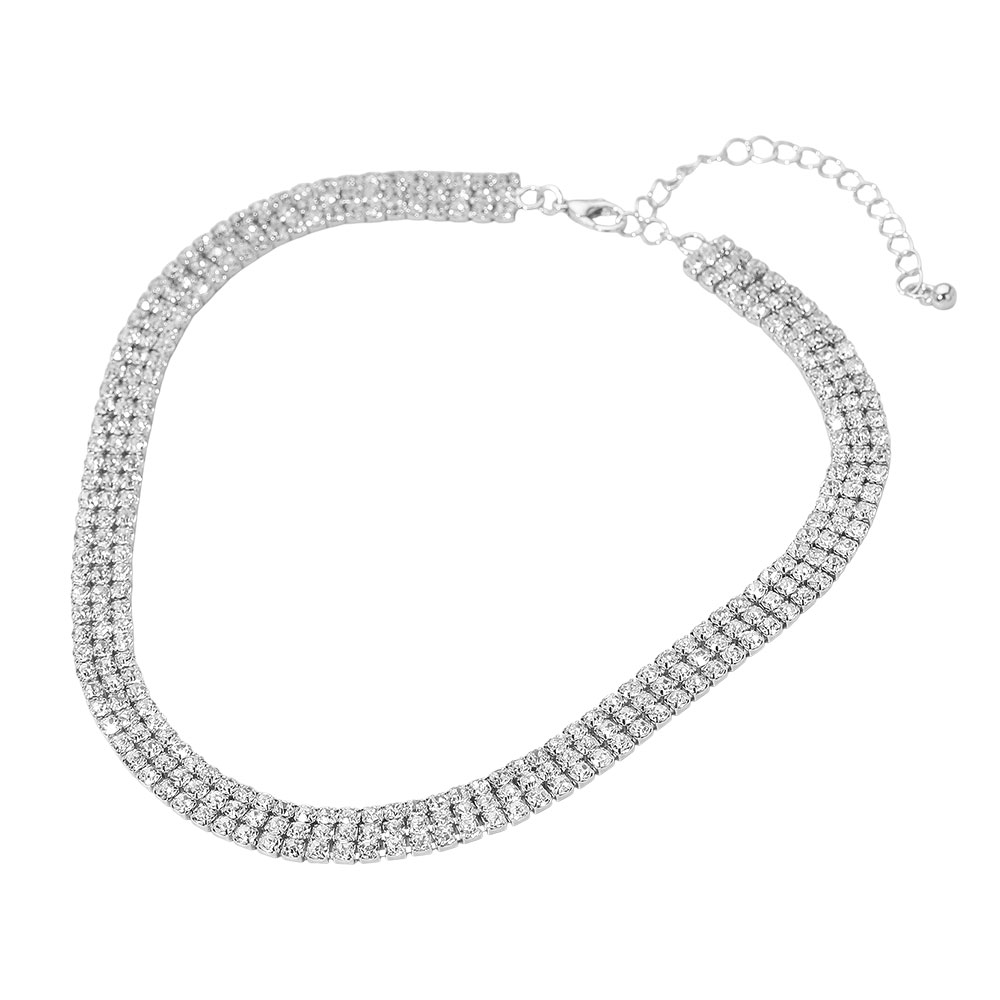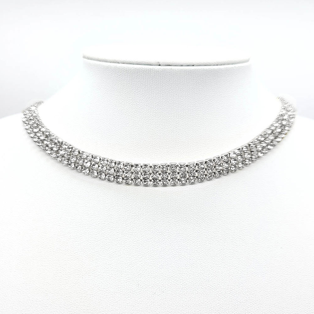 Details • Necklace Size : 15" + 3" L • Decor Size : 0.4" L • Elegant triple row crystal rhinestone necklace designed to sparkle with every movement. Adjustable length for a comfortable fit, making it a perfect statement piece for weddings, parties, and special occasions. • Lead and Nickel Compliant • Sterling Silver Dipped