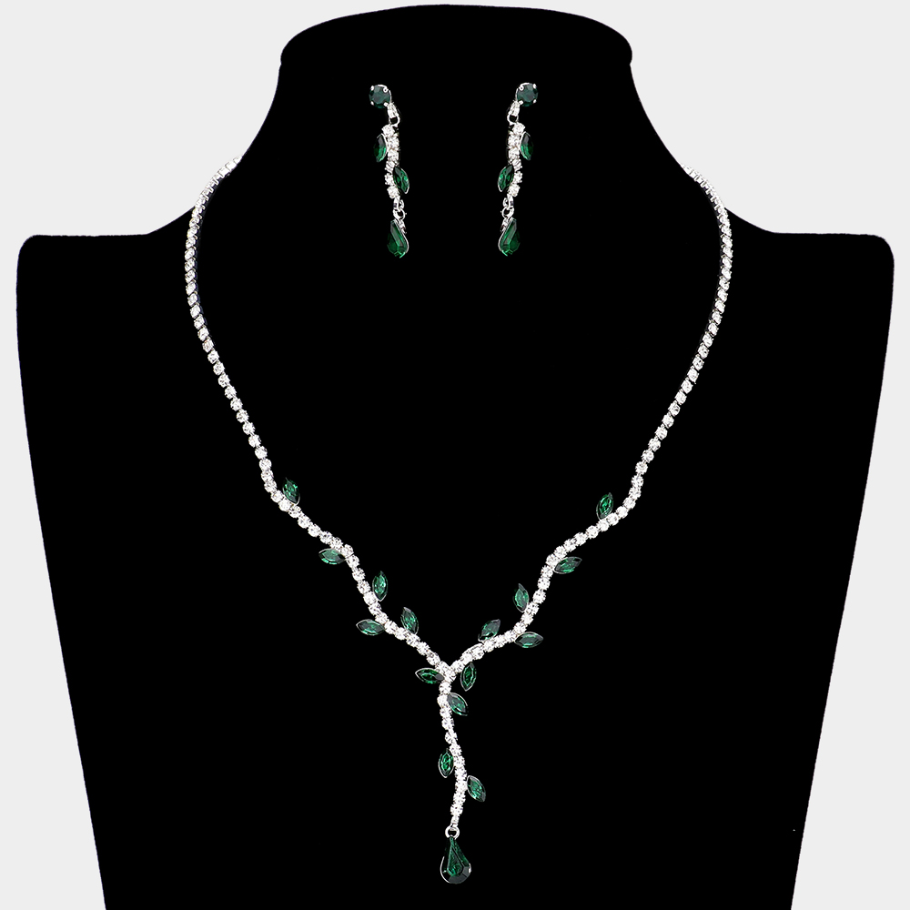 Details • Necklace Size : 16" + 4" L • Decor Size : 1.75" L • Earring Size : 1.5" L • Elegant necklace and earring set with shimmering leaf-shaped stones and a delicate drop pendant. Perfect for weddings, proms, and special events for a refined and glamorous look.