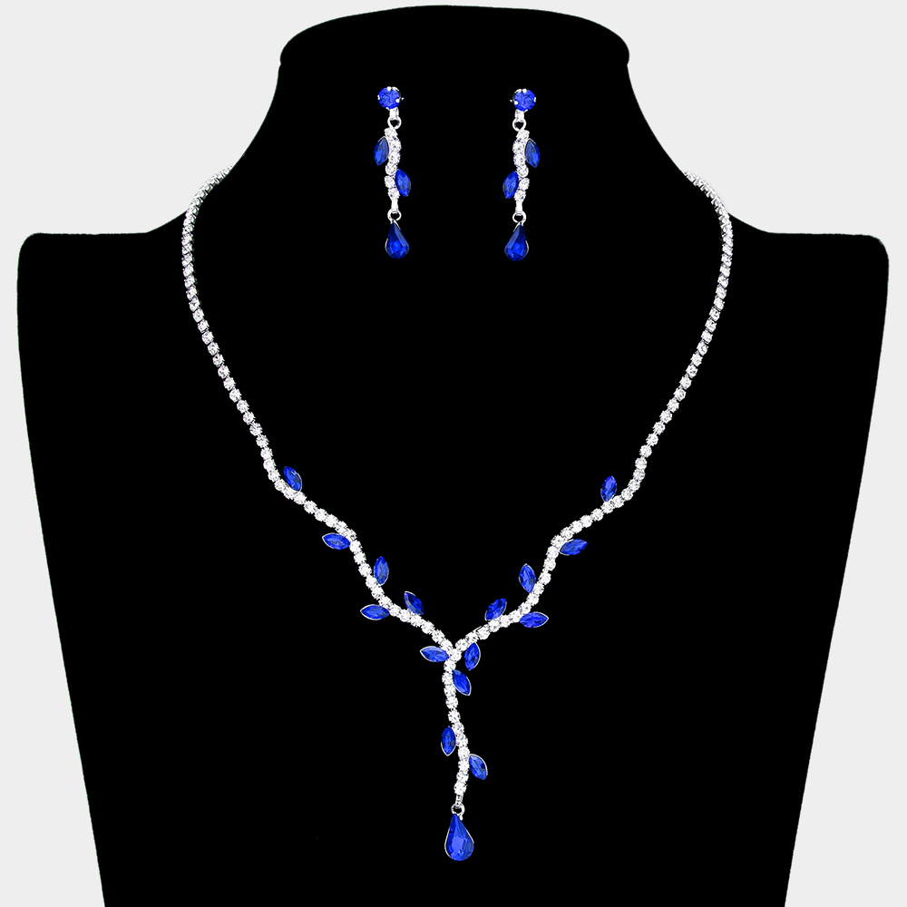 • Elegant necklace and earring set with shimmering leaf-shaped stones and a delicate drop pendant. Perfect for weddings, proms, and special events for a refined and glamorous look.