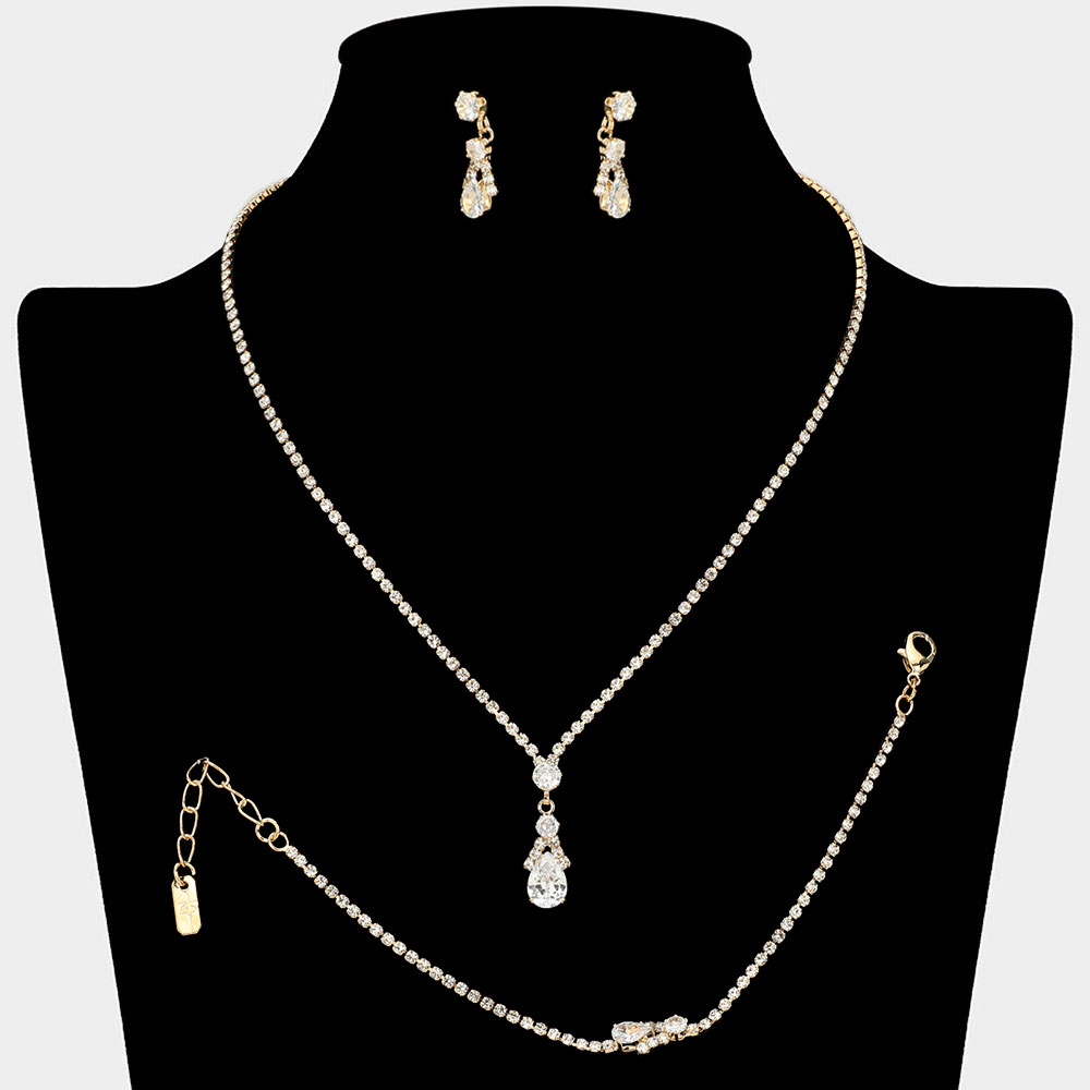 Details • Necklace Size : 16" + 4" L • Decor Size : 1" L • Bracelet Size : 0.3" H, 7" + 2" L • Earrings Size : 0.9" L • Refined and radiant, this jewelry set features a teardrop crystal pendant necklace, matching bracelet, and coordinating drop earrings. Designed with a gold-tone finish and shimmering stones, it’s the perfect choice for weddings, galas, or evening occasions that call for graceful luxury. • CZ Cubic Zirconia