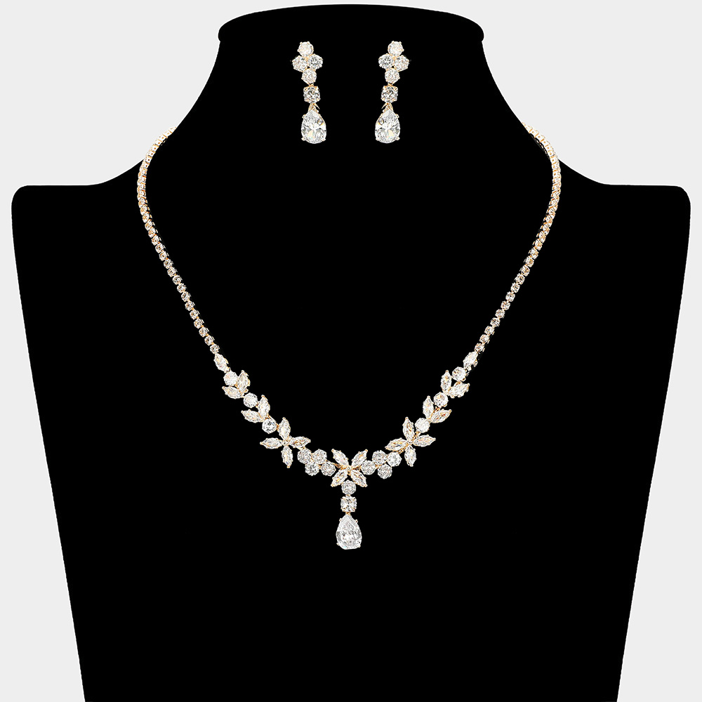 Details • Necklace Size : 16" + 4.5" L • Decor Size : 1.2" L • Earrings Size : 1.2" L • Stunning necklace and earring set with delicate floral accents and a teardrop pendant centerpiece. The matching dangle earrings complete the look, making this jewelry set ideal for weddings, proms, or elegant evening occasions. • CZ Cubic Zirconia