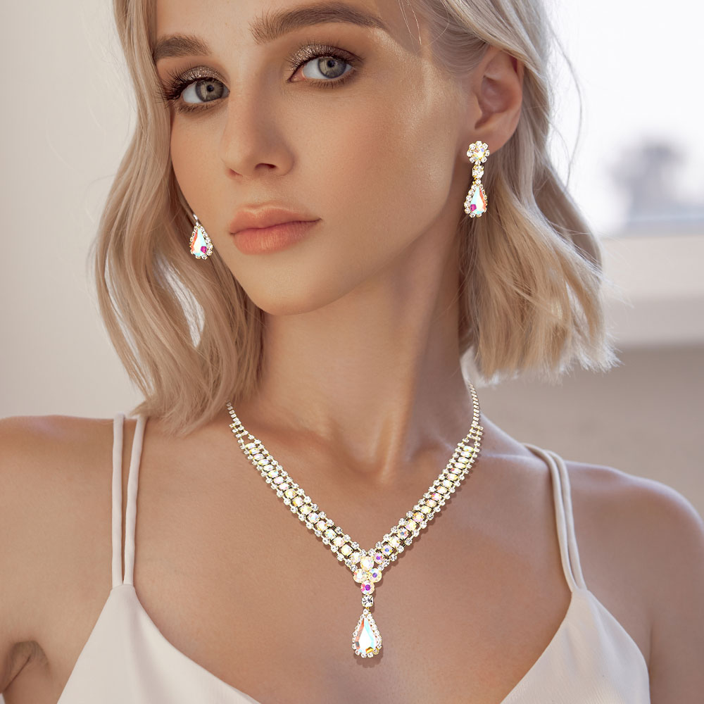 • Elevate your evening look with this sparkling rhinestone necklace and matching earrings set. Featuring a radiant teardrop pendant and shimmering crystals, this set is perfect for weddings, parties, and special occasions, adding timeless elegance to any outfit.