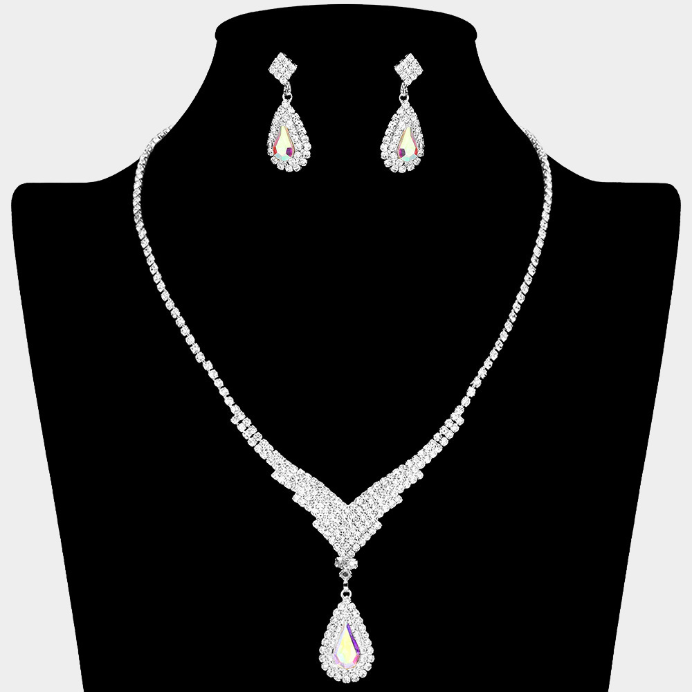 • Shine with this rhinestone teardrop necklace and earrings set, perfect for weddings, formal parties, and prom nights. Featuring a sparkling teardrop pendant and matching earrings, this jewelry set offers timeless elegance and sophistication for brides, bridesmaids, or evening wear.