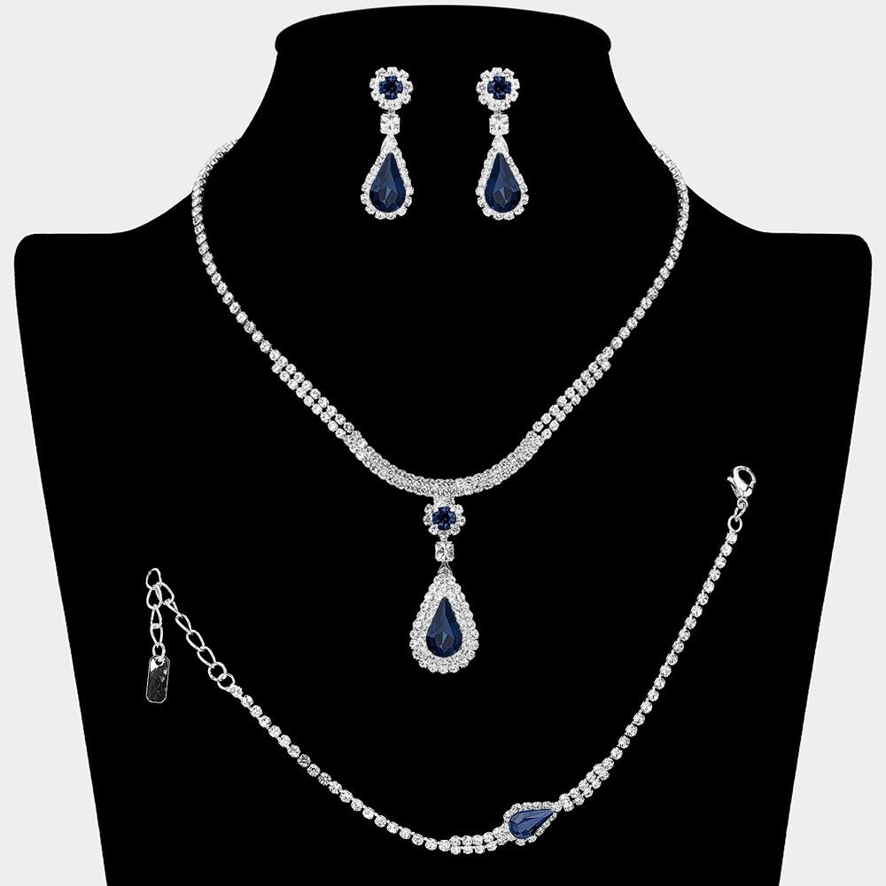 Details • Necklace Size : 16" + 4" L • Decor Size : 1.6" L • Bracelet Size : 0.4" H, 7" + 2" L • Earrings Size : 1.3" L • Enhance your special occasion look with this teardrop crystal necklace, bracelet, and earring set. Featuring a radiant drop pendant and dazzling crystal accents, this timeless jewelry ensemble exudes sophistication, making it perfect for brides, galas, and formal evening events.