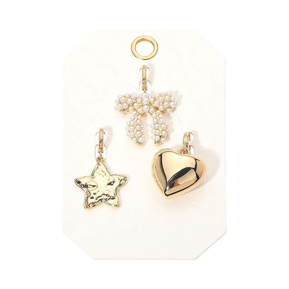 Details • Size : 1.7" L • Enhance your favorite bracelets or necklaces with this timeless pendant charm set featuring a chic bow, modern star, and classic heart design. Perfect for customizing everyday looks or gifting, each charm adds a touch of personality and style to your accessories. Ideal for collectors and jewelry lovers. • Lead and Nickel Compliant