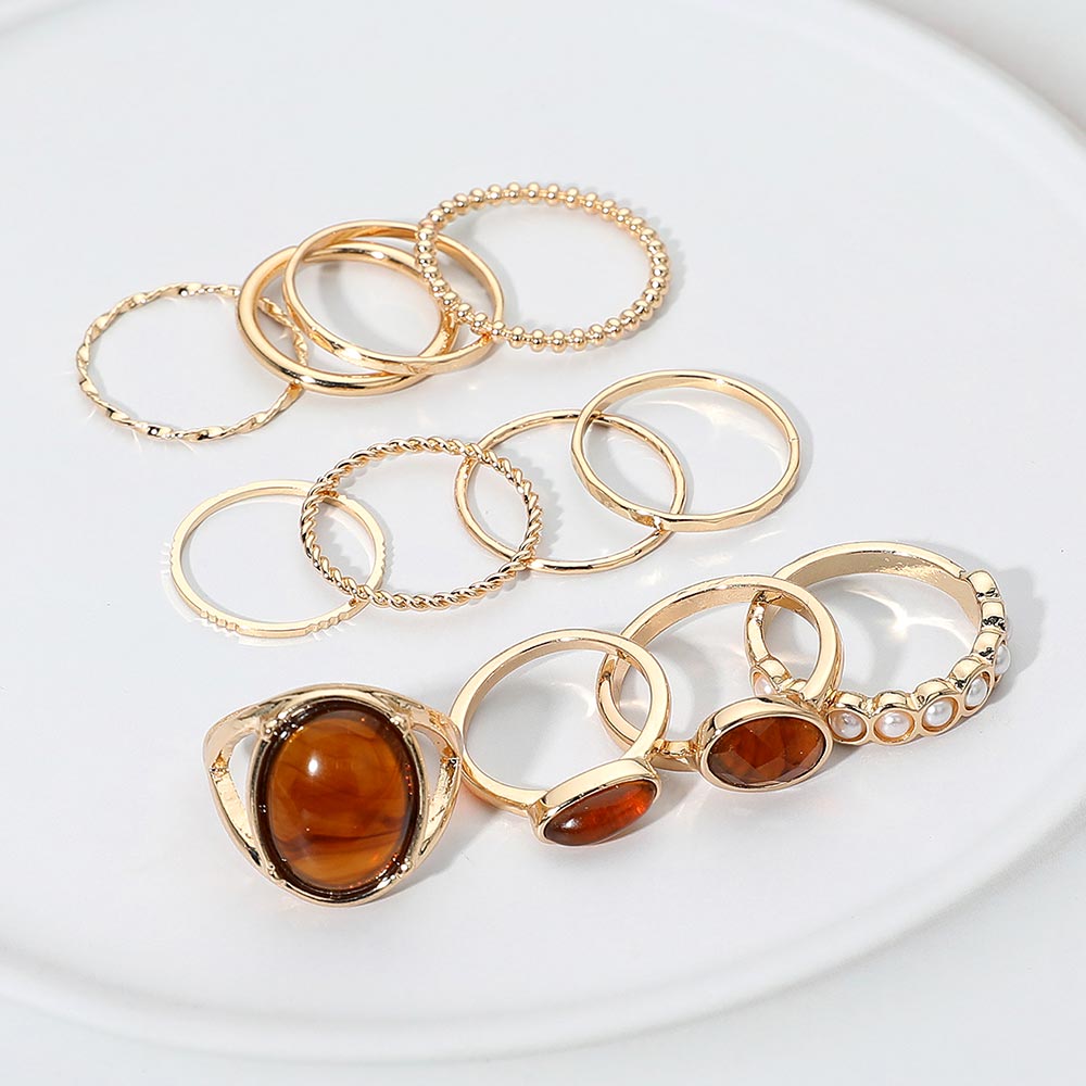 12PCS - Assorted Resin Stone Accent Pearl Link Textured Metal Stackable Ring Set