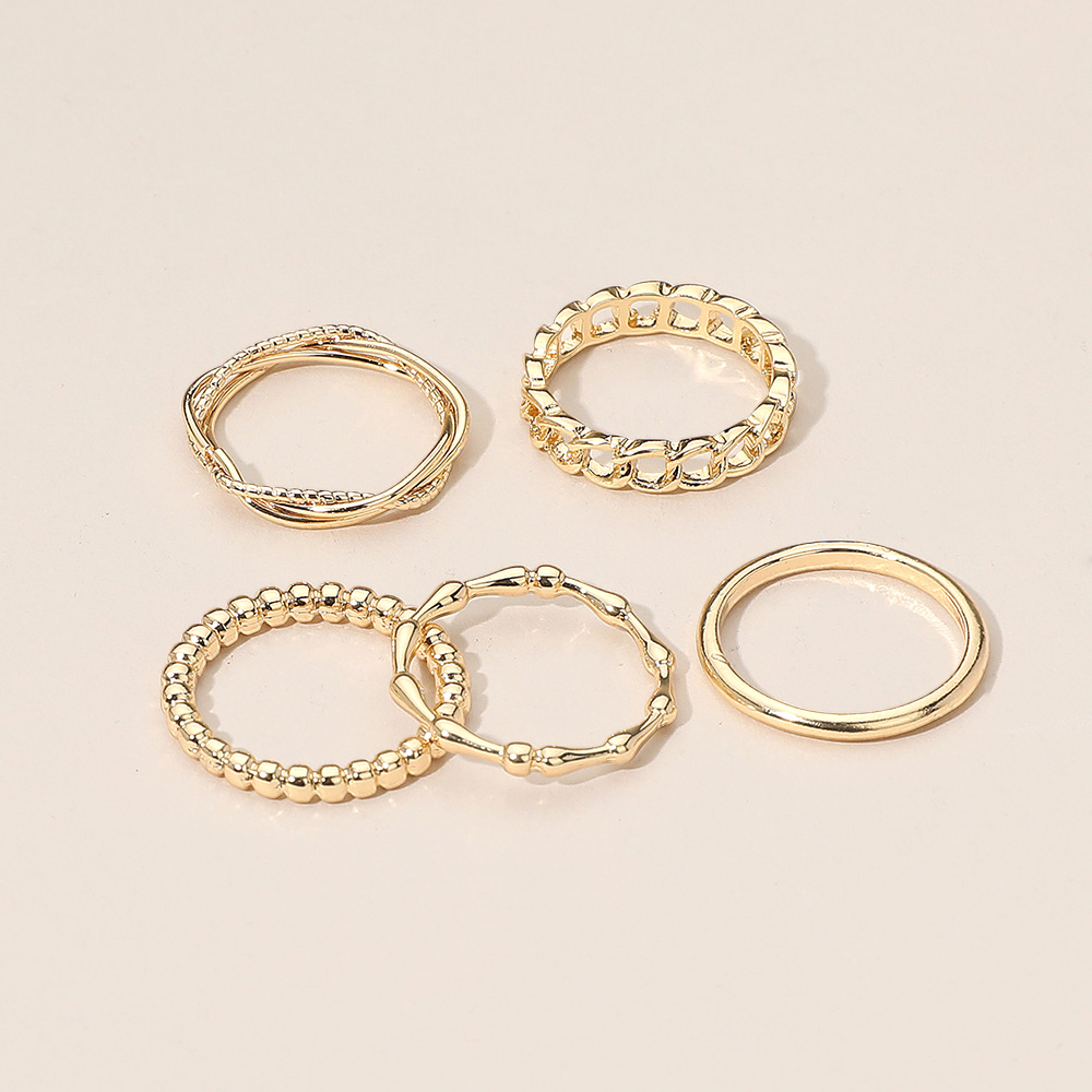 Details • Size : 0.1" - 0.2" H • Elevate your style with this chic multi-band stackable ring set featuring a mix of smooth, textured, and chain-inspired designs. Perfect for versatile wear, these rings can be layered together or worn individually for a sophisticated and trendy statement look. • Lead and Nickel Compliant