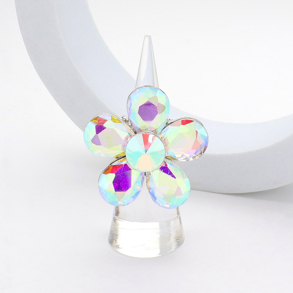 Details • Size : 1.5" H • Stretchable • Elegant flower-shaped statement ring featuring a dazzling faceted petal design that catches the light beautifully. Perfect for adding a bold, eye-catching accent to any outfit, this gem-inspired accessory enhances your style with its unique shape and sparkling radiance. • Lead and Nickel Compliant