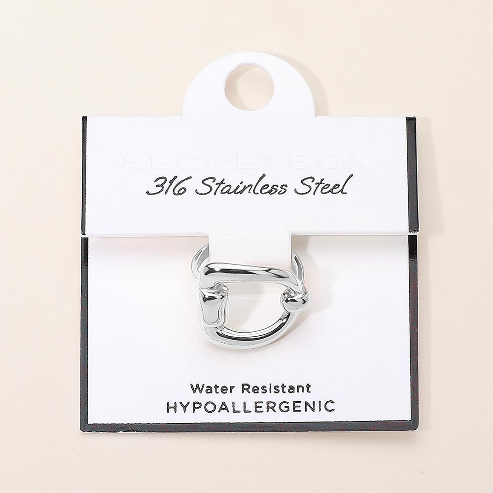 Details • Size : 0.75" H • Size 7 Only • Contemporary geometric stainless steel open ring featuring a bold sculptural silhouette with smooth, polished curves. Its modern artistic design adds a touch of sophistication and creativity to any look, making it a perfect statement accessory for both casual and elegant styles. • Hypoallergenic • Stainless Steel