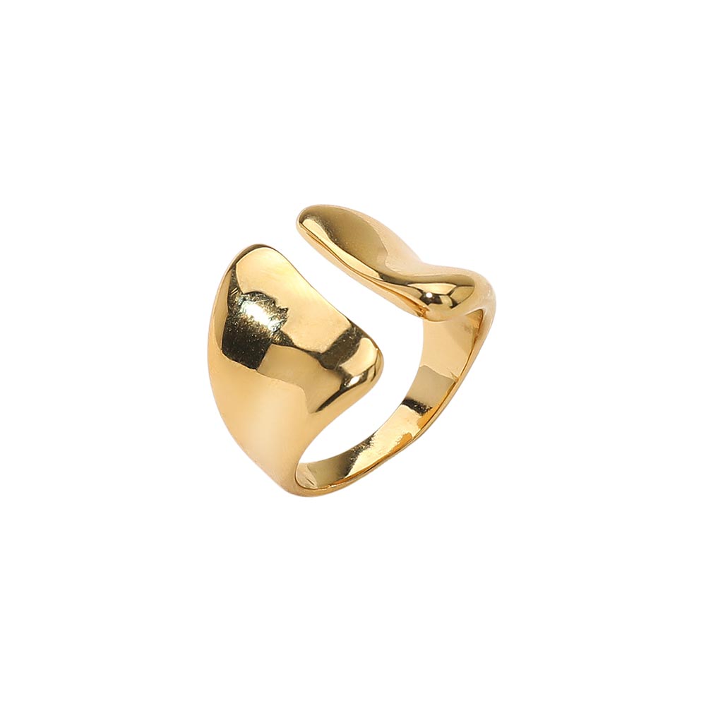 Details • Size : 0.7" H • Size 7 Only • Contemporary stainless steel open band ring showcasing a smooth, fluid organic shape with a bold sculptural finish. Designed for everyday elegance, this minimalist statement ring complements any outfit with its artistic and modern appeal, perfect for layering or solo wear. • Hypoallergenic • Stainless Steel