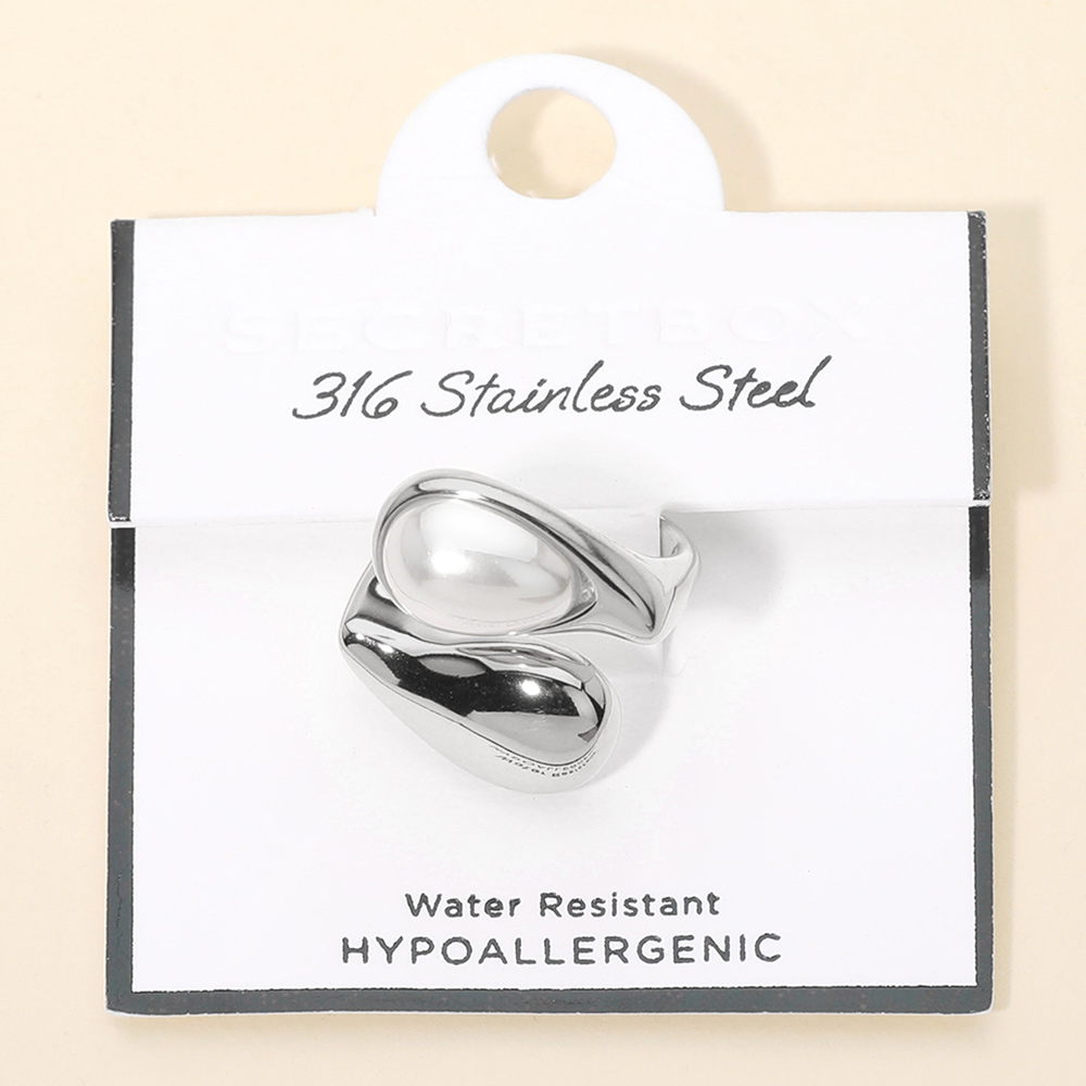 Details • Size : 1" H • Adjustable • Water Resistant • Sculptural open wrap ring featuring a smooth domed cabochon accent paired with a fluid curved band. The bold silhouette creates a modern statement while maintaining a balanced, wearable design. Ideal for boutiques seeking elevated everyday rings with contemporary appeal and strong visual impact. • Hypoallergenic • Stainless Steel