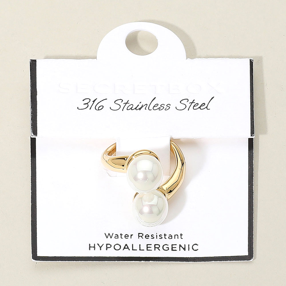 Details • Size : 0.8" H • Adjustable • Elegant adjustable ring featuring two round pearl accents on an open band design. Made of stainless steel, this refined piece adds a sophisticated touch to both casual and formal ensembles with minimal effort. • Hypoallergenic • Stainless Steel