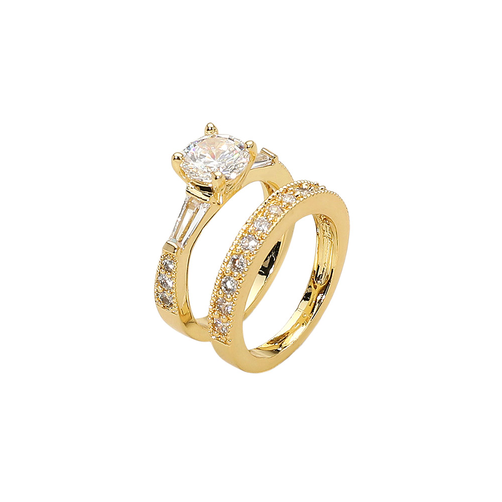 Details • Size : 0.2" - 0.25" H • Elegant two piece ring set featuring a round cut cubic zirconia centerpiece complemented by a matching band adorned with shimmering pave accents. A timeless and refined design perfect for engagements, weddings, or adding sophisticated sparkle to everyday looks. • CZ Cubic Zirconia