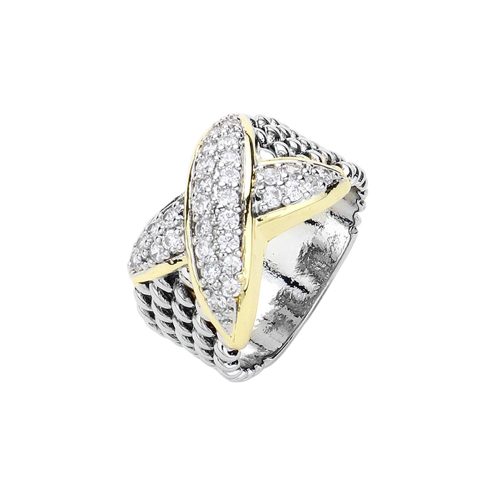Details • Size : 0.5" H • X-shaped ring with textured detailing and sparkling pave accents. A bold accessory that adds glamour and elegance to any outfit. • CZ Cubic Zirconia