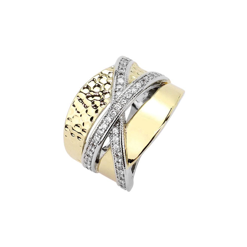 Details • Size : 0.7" H • Make a bold statement with this wide crossover band ring featuring textured details, polished shine, and sparkling accents. A stylish two-tone design perfect for special occasions, everyday wear, or gifting to someone who loves modern elegant jewelry. • CZ Cubic Zirconia