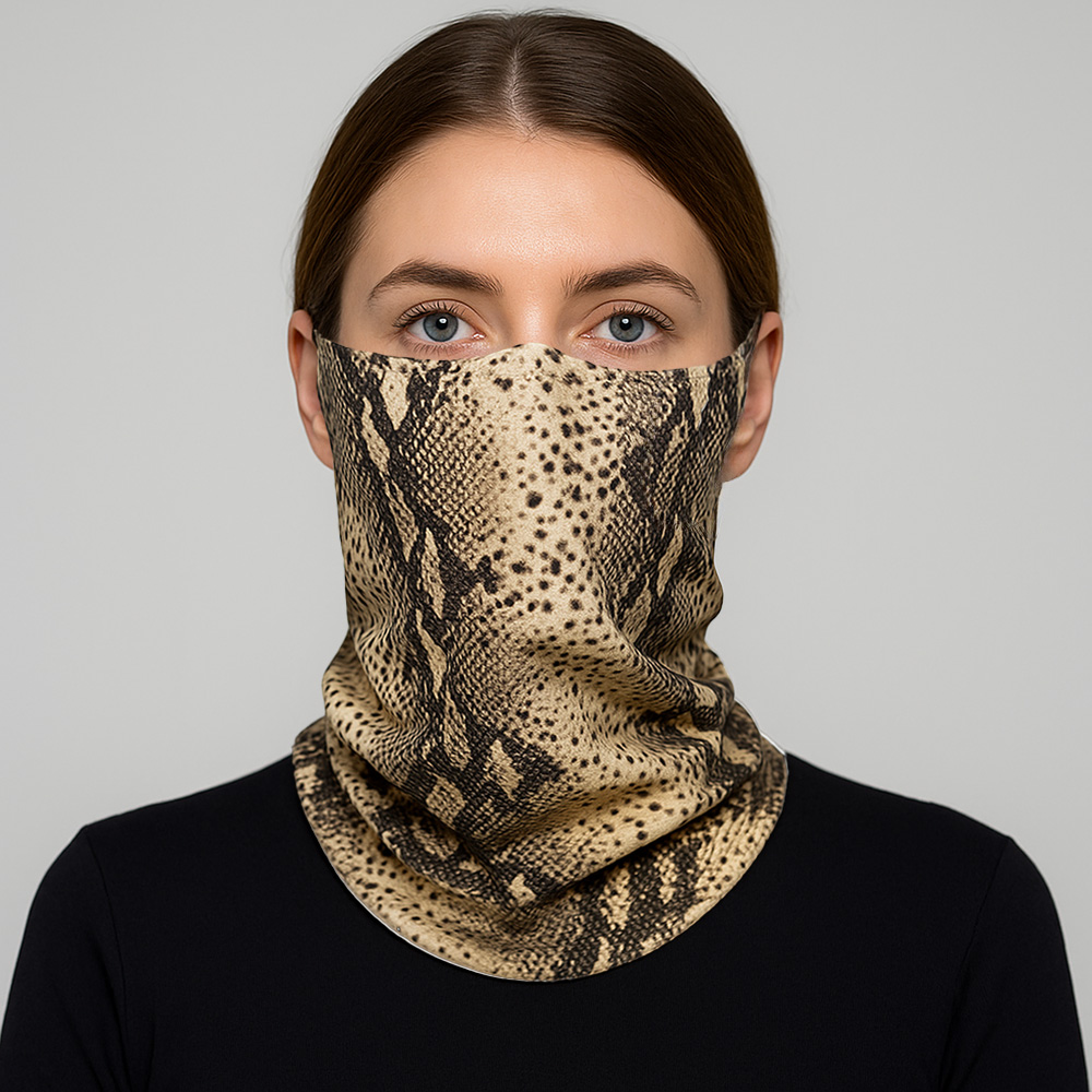 Details • 100% Polyester • Size : 12.2" X 9.4" X 12.6" • Can be worn as Mask or Scarf • Has Ear Hole • Elevate your style with this snakeskin print face and neck gaiter. A versatile accessory designed for use as a face cover, scarf, bandana, or headband. Lightweight and breathable, perfect for outdoor activities, travel, and everyday wear.