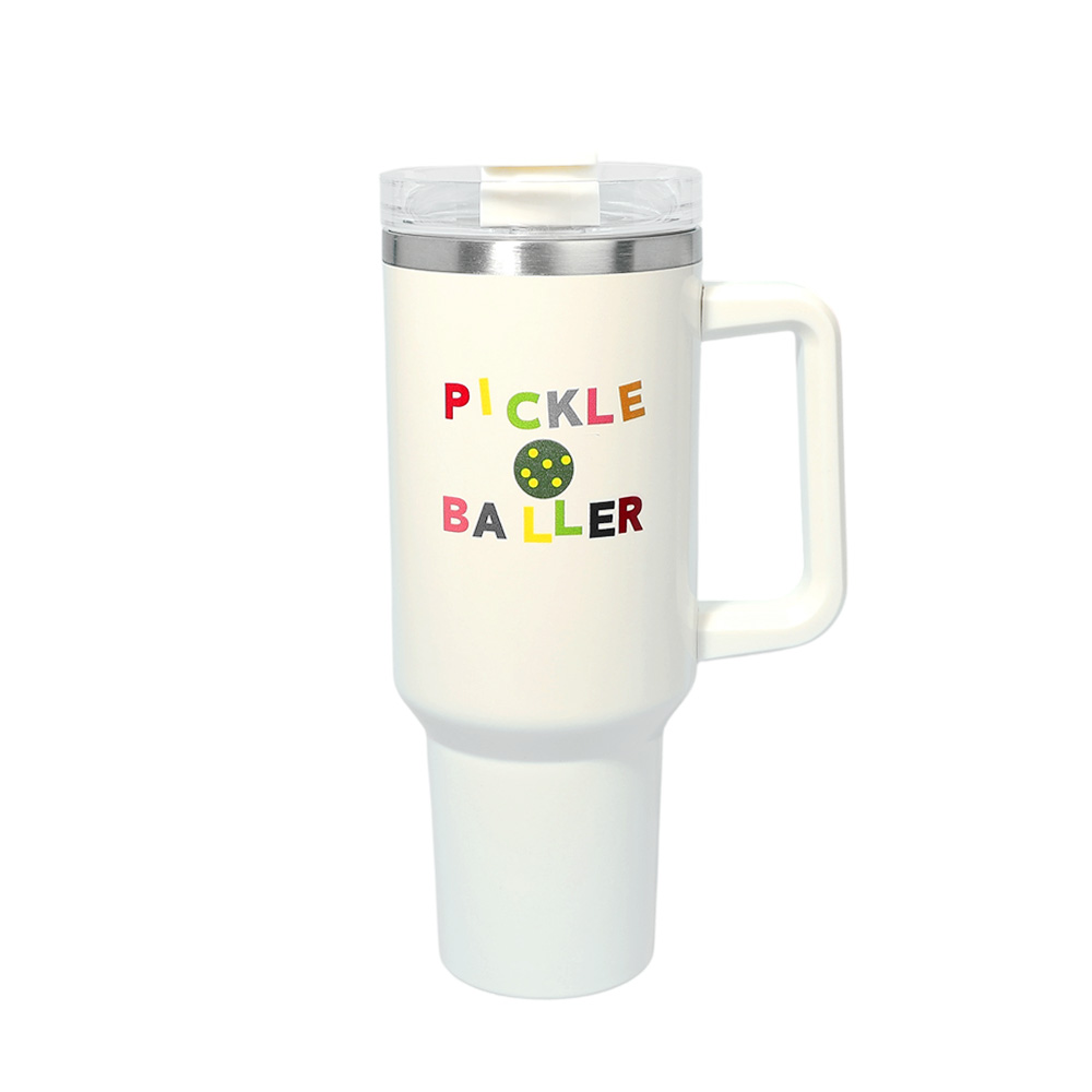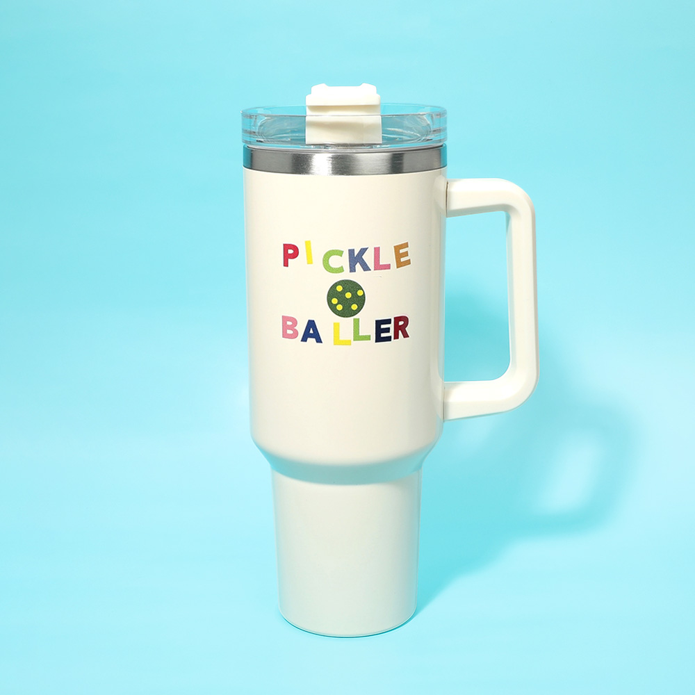 Details • Size : 4" X 10.5" (40oz) • Straw Size : 12" L • Lid, Straw and Brushes Included • Double Wall Vacuum Insulation • Cup Holder Friendly • Hot and Cold • Stay hydrated on the go with this Pickle Baller travel tumbler mug, featuring a secure lid, sturdy handle, and bold pickleball-inspired design. Perfect for hot or cold drinks, this large-capacity mug makes a fun and practical gift for players and fans who love showing off their pickleball pride. • Stainless Steel