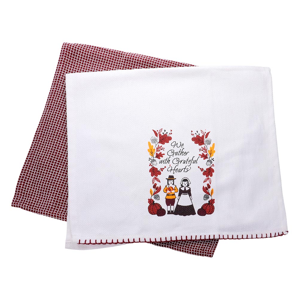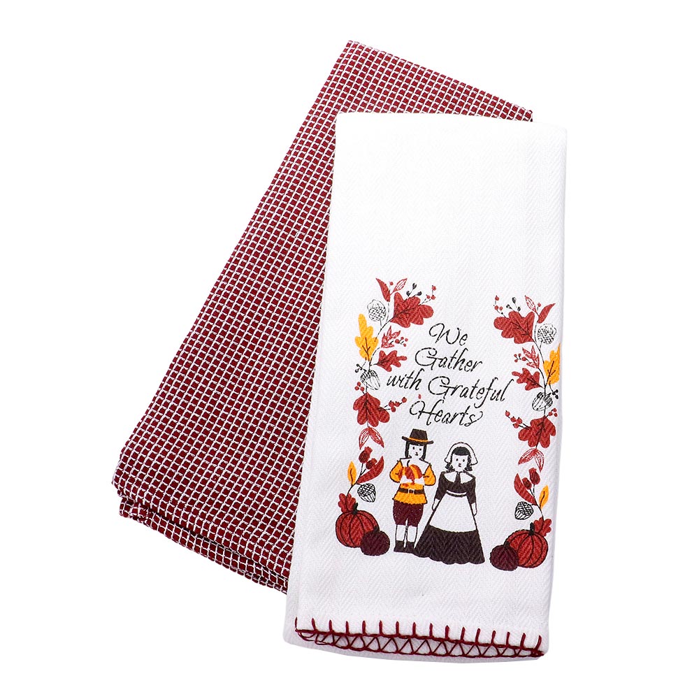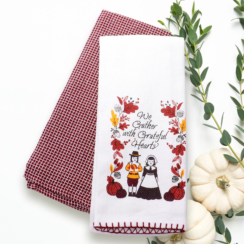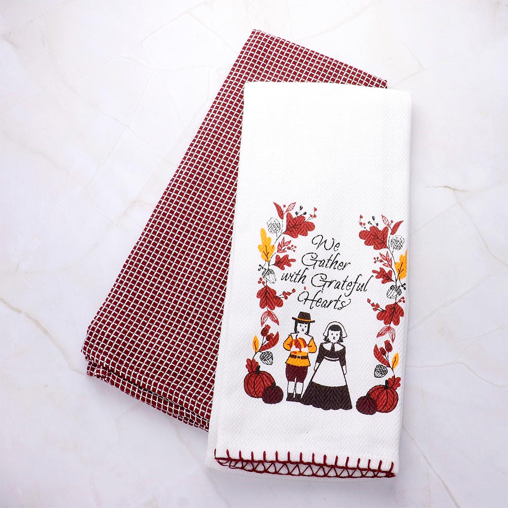 2PCS - We Gather with Grateful Hearts Message Thanksgiving Printed Gingham Kitchen Towel Set