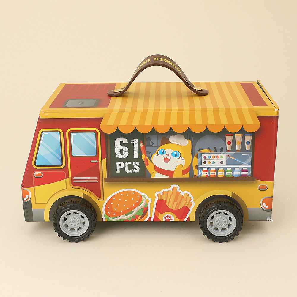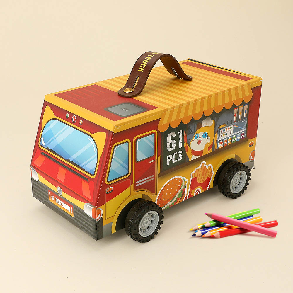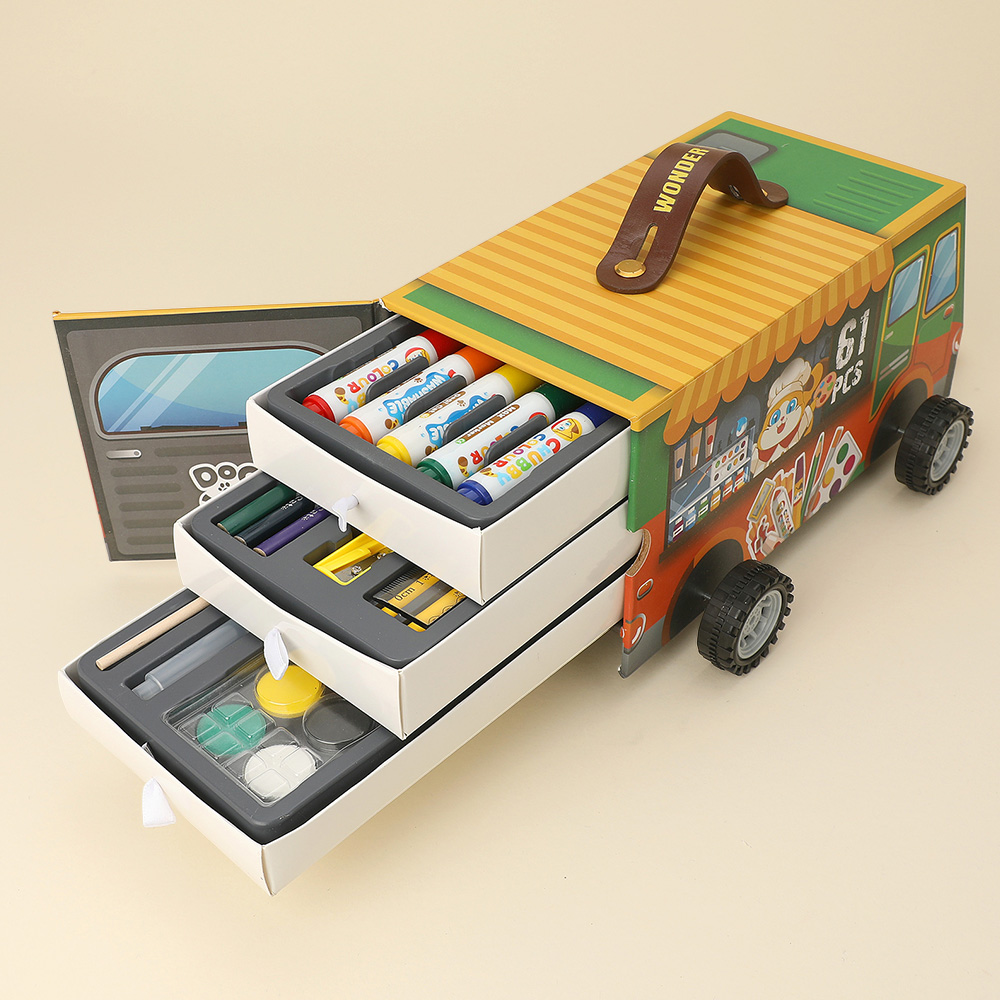 Details • Size : 10" X 5" • Top Handle Size : 1.5" L • 1 Ruler, 1 Brush, 1 Eraser, 1 Palette, 15 Stickers, 2 HB Pencils, 1 Blossom Palette, 1 Watercolor Brush, 5 Washable Markers, 1 Coloring Book, 8 Watercolor, 1 Sharpener, 6 Oil Pastels, 6 Color Pencils, 10 Paper Clips Included • Exciting 61-piece art truck set featuring markers, pencils, watercolors, stickers, and more in a fun rolling truck case. Complete with drawers for easy storage, this portable art kit encourages creativity and imagination, making it a perfect gift for young artists and craft enthusiasts.