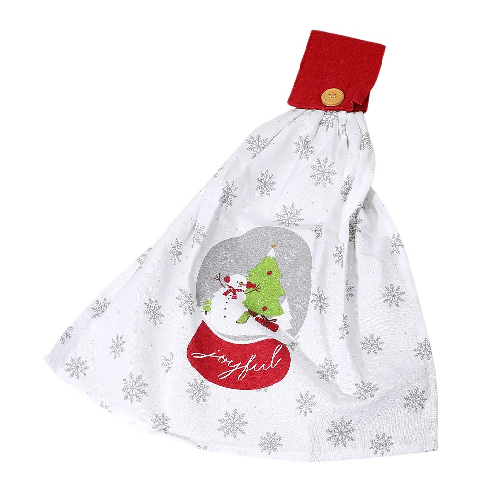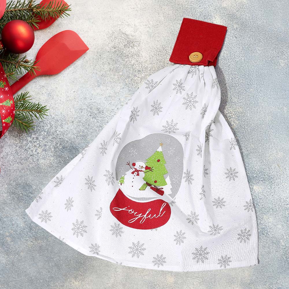 Details • Size : 16" X 18" • Material : 100% Cotton • Add festive charm with this hanging towel featuring a snowman and Christmas tree in a snow globe design. Perfect seasonal accent for kitchen or bathroom with easy button loop. • Made In India