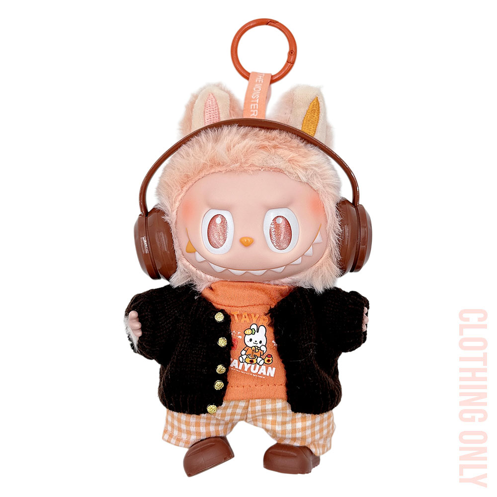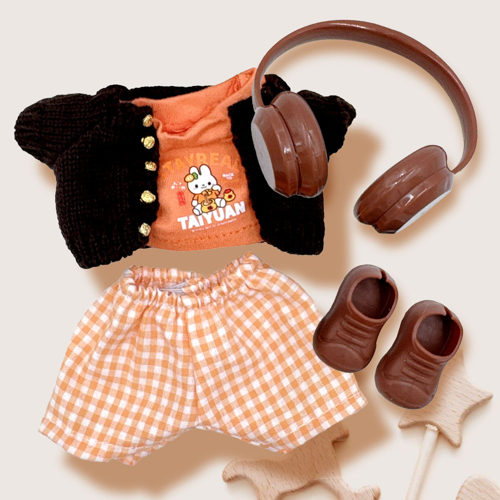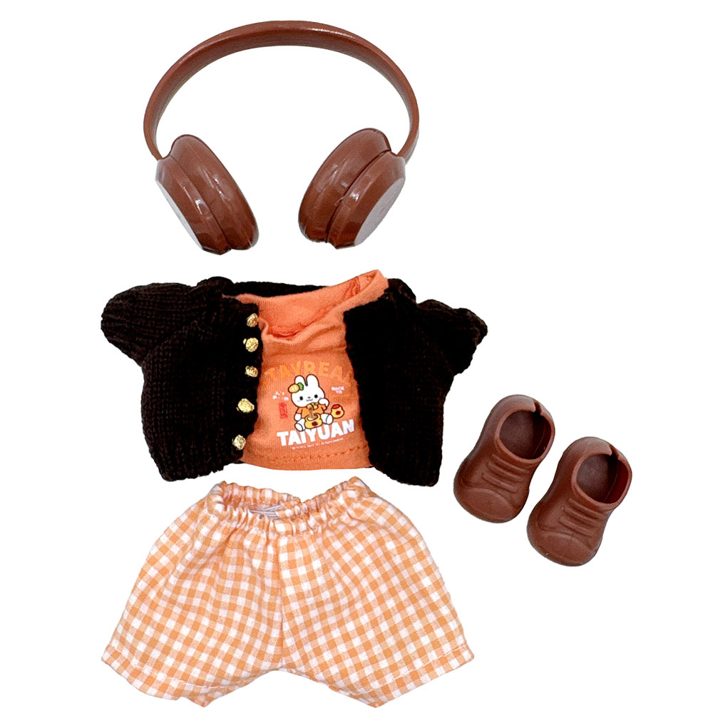 Details • Size : One Size • Material : 100% Polyester • Doll Compatible • Doll NOT Included • Stylish doll outfit set includes a knit button-up cardigan, casual tee, gingham shorts, matching headphones, and slip-on shoes. Perfect for adding personality and charm to any doll collection.