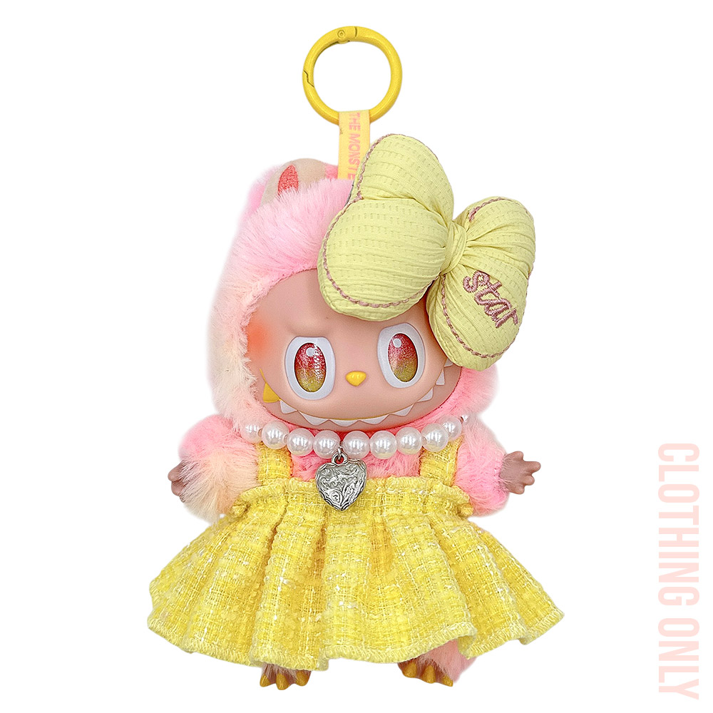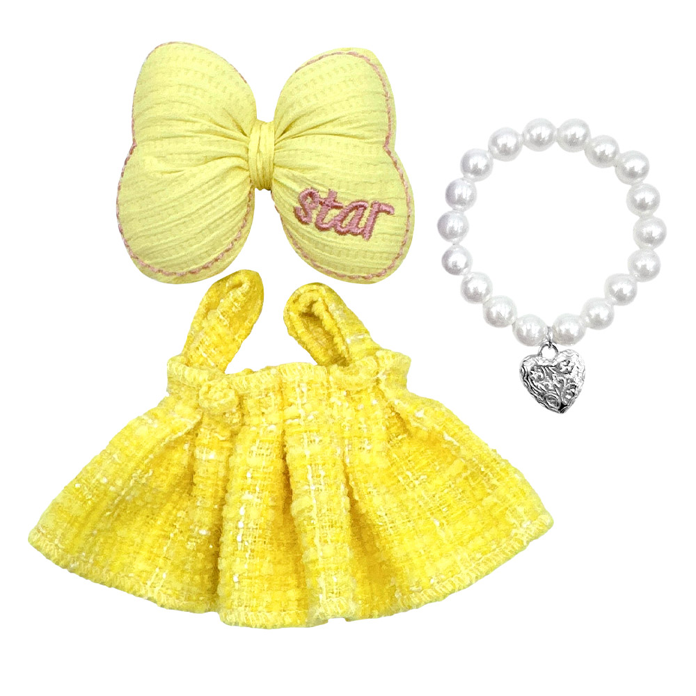 Details • Size : One Size • Skirt, Bow and Pearl Necklace Included • Doll Compatible • Doll NOT Included • Material : 100% Polyester • Complete outfit set for mini plush dolls including a bow, skirt, and pearl-style bead necklace. Perfect for dressing up your collectible figures. Clothing only.