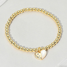 Stainless Steel CZ Stone Accent Mother of Pearl Heart Charm Stretch Bracelet